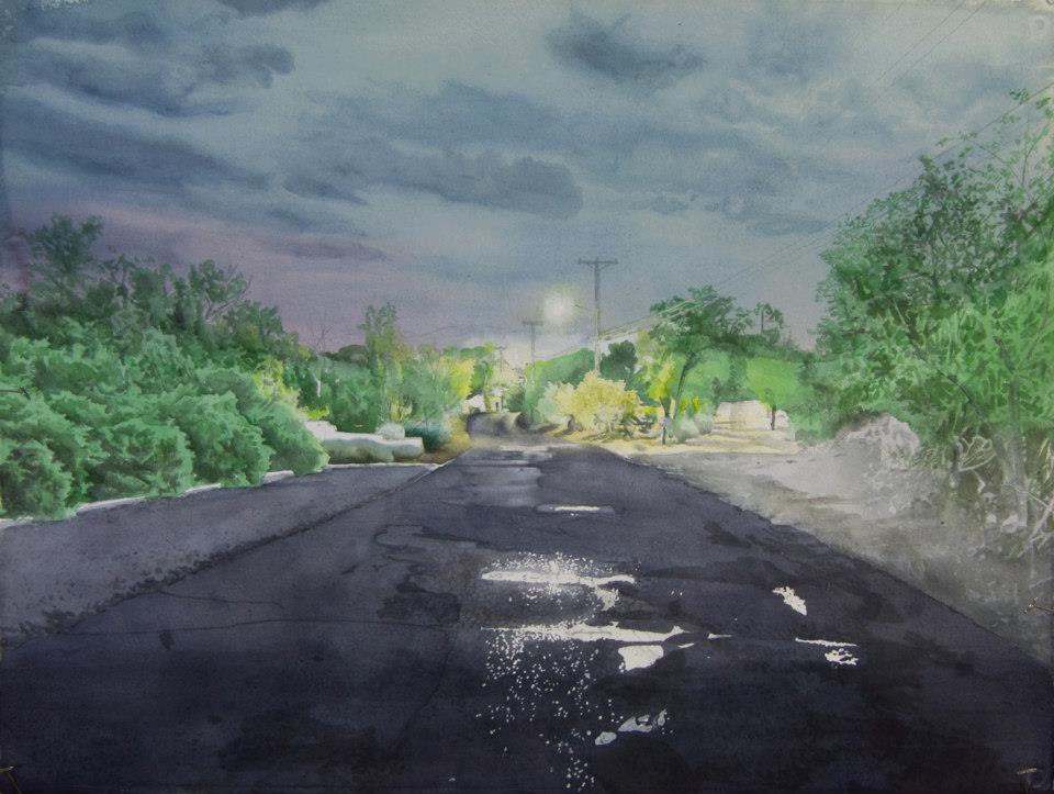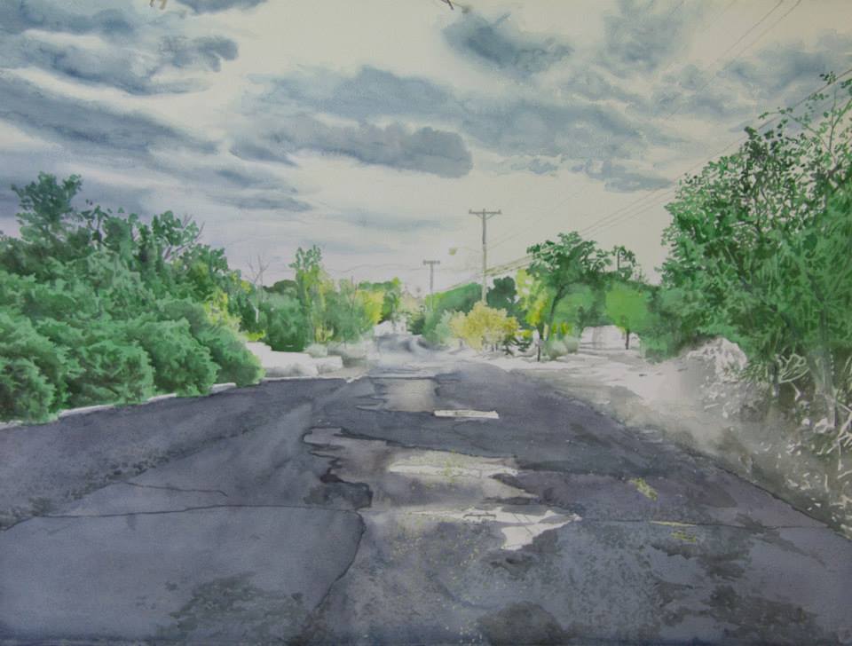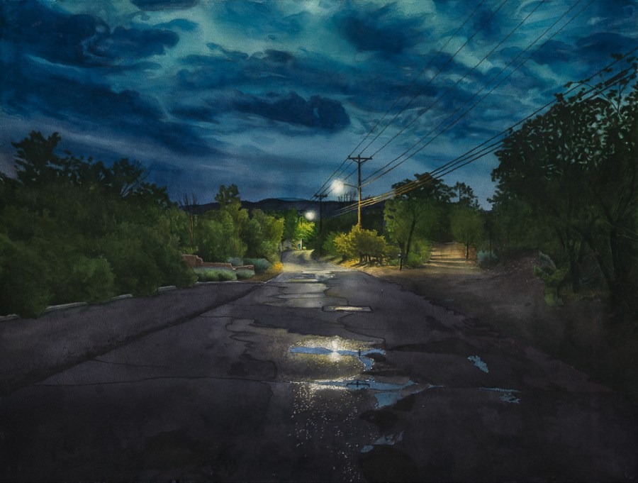 This was from a series of late night/early morning photographs taken around Santa Fe in the summer of 2013. The photograph from which this was painted was taken about 4am. This painting was accepted into the Masterworks of New Mexico exhibition in 2015.